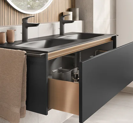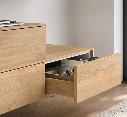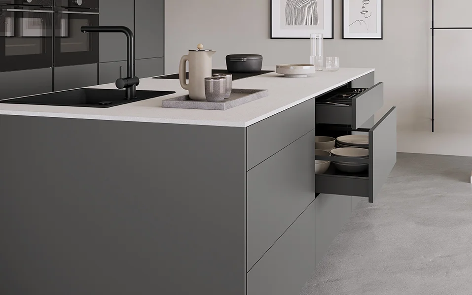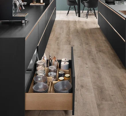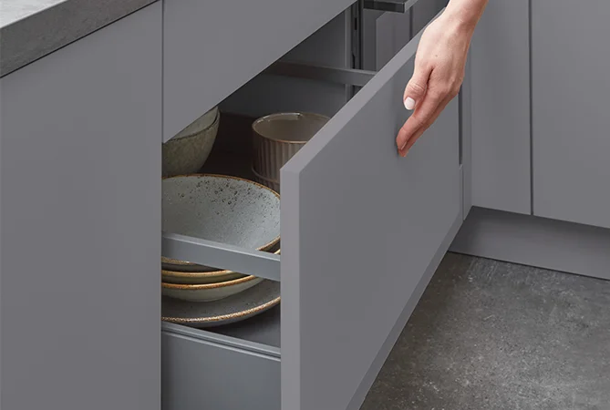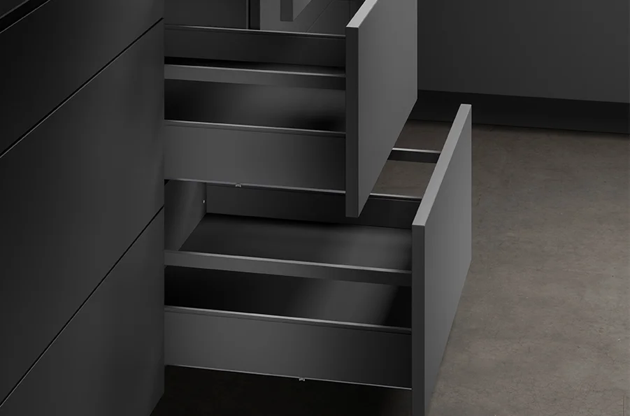 Das Schubkastensystem überzeugt mit einer verdeckten Führung und einer optionalen Push-to-open-Funktion, die ein müheloses Öffnen und ein sanftes, gedämpftes Schließen ermöglicht. Die schlanken Zargen sorgen außerdem für eine maximalen Stauraum.