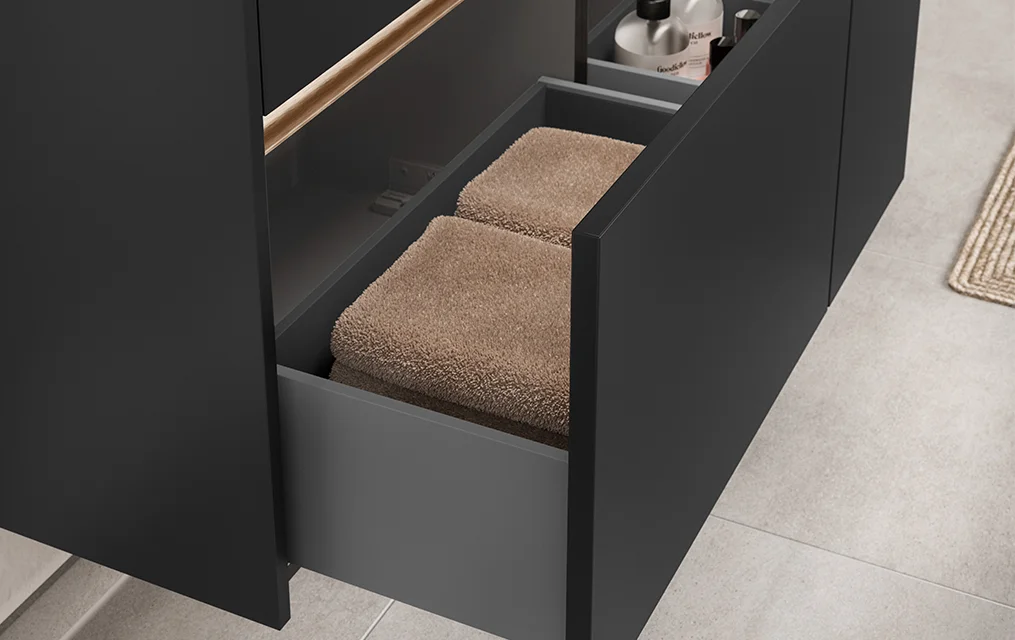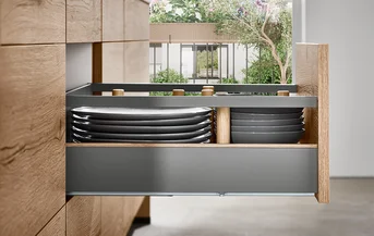 The nBOX impresses with its filigree, angular design and the slim drawer frame of just 10.7 millimetres. The straightforward, minimalist aesthetics are a feature of our entire pull-out system and interior in form and colour. The elegant slate grey, also reflected as an option in the cabinet interior, is perfect for a consistent design in the kitchen, bathroom and living room.