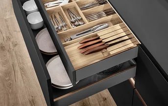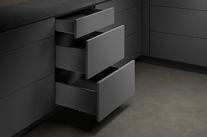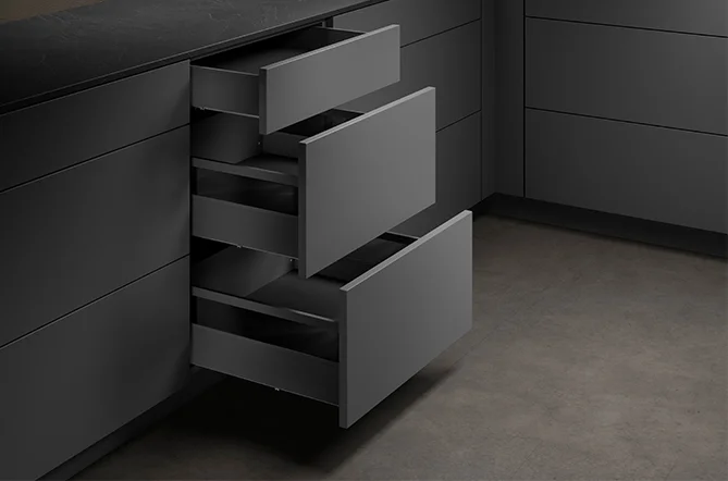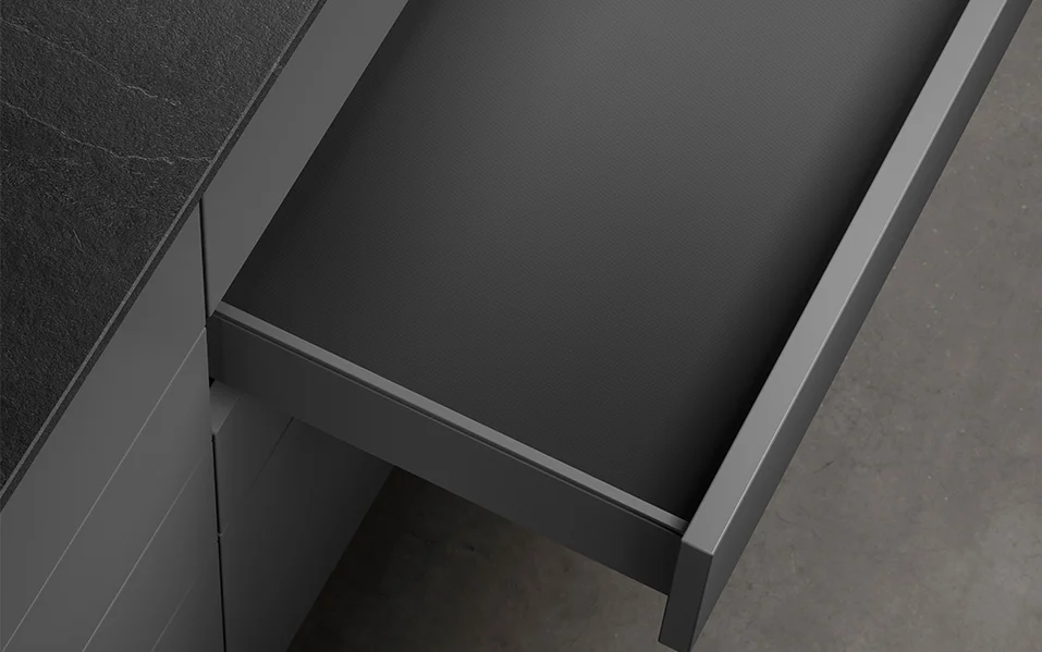 Our new drawer system embodies minimalism in simple perfection. With its narrow frame, the nBOX features a fascinatingly clean, cubic style. The slate grey colour gives the drawer timeless elegance. The sophisticated premium design of this drawer defines our entire pull-out system and unit interior design in style and colour. Benefit from a uniform look, fully coordinated down to the smallest details.