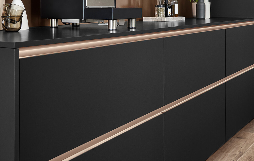 Our handleless LINE N range has been extended to include the new recessed handle 012 in metallic bronze. With its warm, elegant colouring, bronze lends any room a special depth and a sophisticated design. The metallic surface sets modern accents and blends harmoniously into various furnishing styles.
