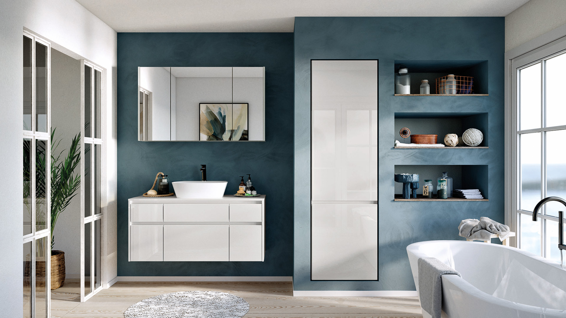 Soft light meets clear shapes. Room-high sliding doors zone the floor plan and combine the bedroom and bathroom to create a harmonious living concept. The high-gloss taupe grey front complements the grey glass and lends depth and calm. Everything important remains discreetly within reach thanks to the larder unit. Filigree pedestals give the washbasin cabinet a light, elegant appearance, either in a timeless skid design or as a modern four-legged model. The result is a bathroom that looks spacious and impresses in everyday life.