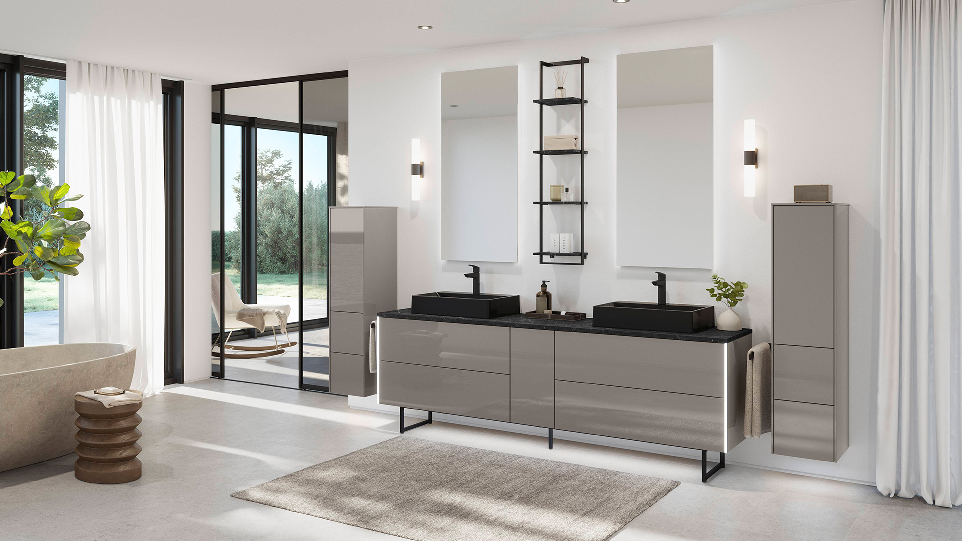 This bathroom is perfect for the whole family - stylish, functional and thoughtfully designed. High-gloss genuine lacquer fronts in satin grey, which harmonize tone-in-tone with the matching worktop, create a modern and elegant look. A wide mirror above the wash cabinet completes the design and brings brightness and space into the room.