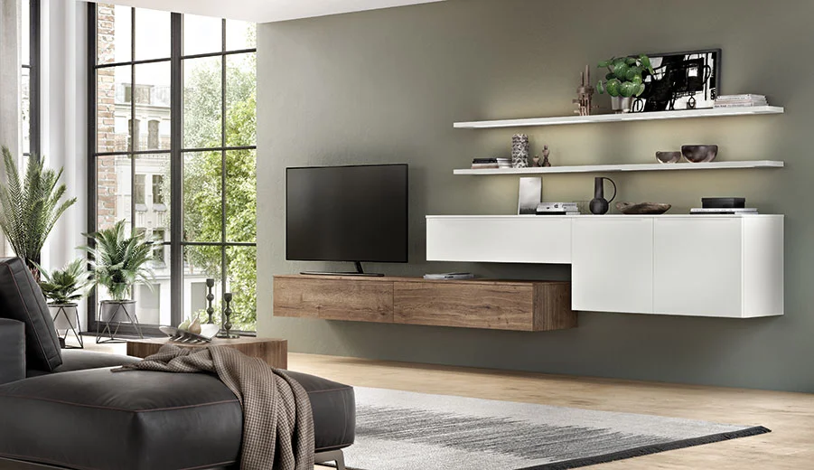 Enjoy greener living in the city! Mineral green elements with grey accents give this living space design its modern natural appeal. The kitchen is truly an all-rounder in urban life, thanks to versatile storage space solutions and creative details like pole-mounted shelving with plant grow lights for sustainability in everyday life. The small pantry is subtly concealed behind access doors. The functional wardrobe solution by the entrance integrates perfectly into the open-plan space. A special highlight feature is created by the combination of both Easytouch fronts, which impress with their velvety matt look and easy-care anti-fingerprint coating.