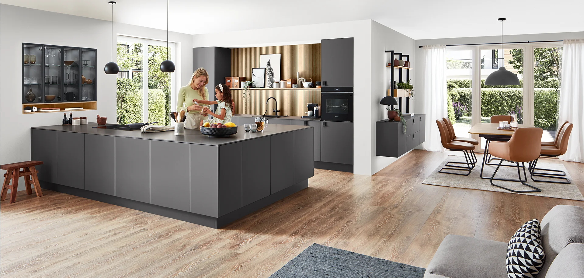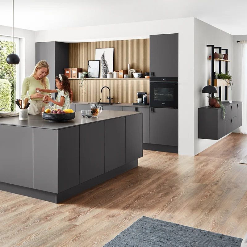 The perfect match. Dark surfaces and well-designed handles in matt black and cool metal give the kitchen its individual character. The ceramic niche cladding and matching worktop in Metal oxide décor are easy to care for and uncomplicated. A strong solution, and not just for fans of metal.