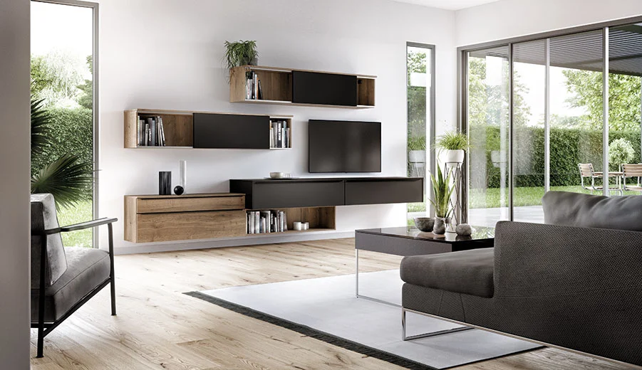 An elegant welcome. The floating sideboard in ultra matt black with handles in a matching shade is complemented by the plug-in wall shelf in an oak look. Combine with a large mirror that blends in harmoniously.