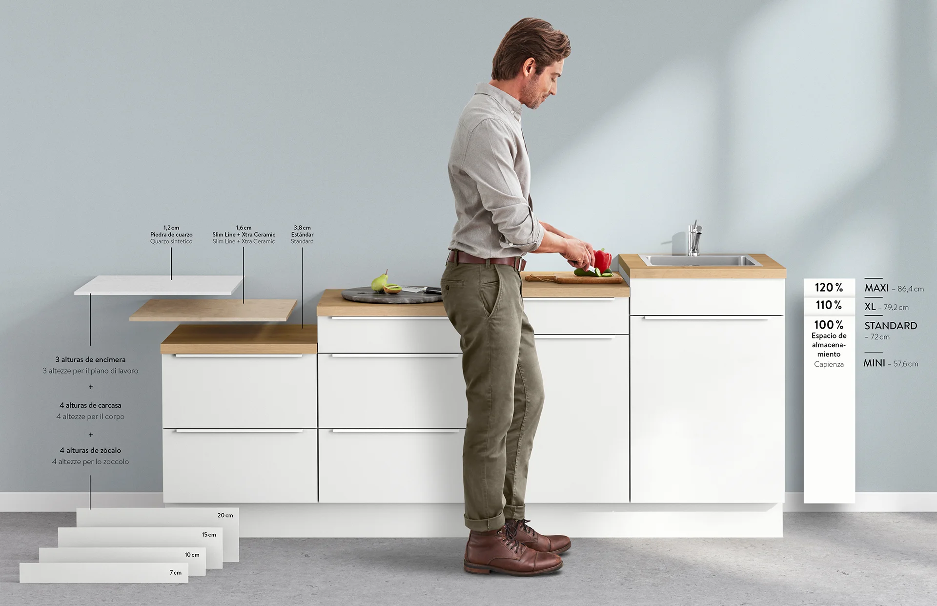 Para las distintas tareas, como preparar los alimentos, cocinar y lavar, ofrecemos además la correspondiente altura activa adecuada desde punto de vista ergonómico y que, por tanto, evita sobrecargas. La adaptación precisa individualizada se consigue mediante cuatro alturas de zócalo y tres alturas de encimera diferentes. ¡Actívese!