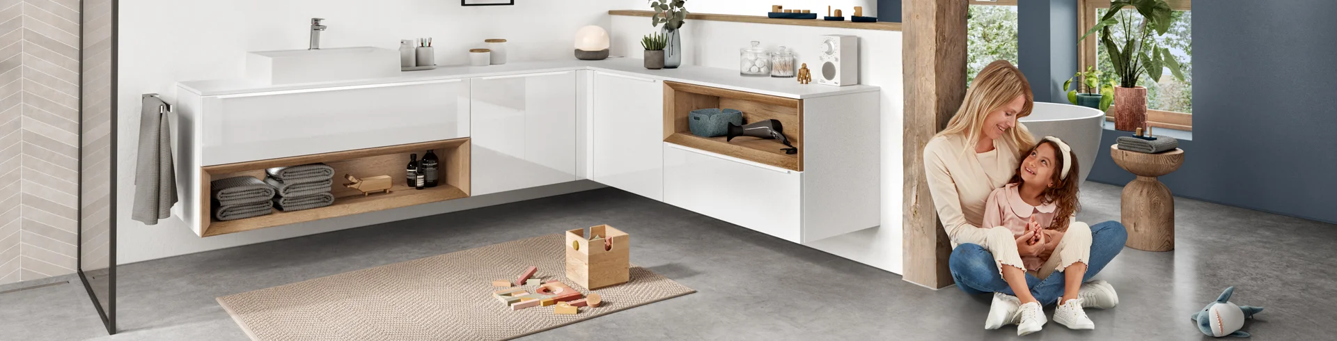 Sumérjase en un mundo de color completamente nuevo. El color de moda, el coral, dota a los muebles del cuarto de baño de un suave resplandor, realzado por el tacto aterciopelado y cálido de las superficies mates. Contraste creativo: tiradores metálicos, grifos y el sistema de barra Sign Emotion con estanterías móviles y detalles individuales en negro.