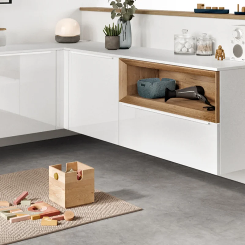 El gris pizarra se fusiona con los materiales naturales: la forma más vanguardista de combinar elegancia y diseño. Versátil y de gran belleza: los elementos de estante Case añaden un toque actual al armario de la pared. Y detrás de la puerta corredera se esconde espacio adicional con un estilo a juego.