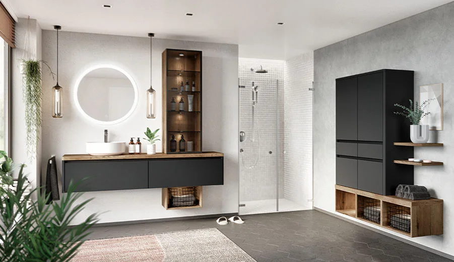 Puede obtener mayor generosidad para cada baño mediante frentes de grandes formatos y un concepto de color general, por ejemplo, en el suave gris taupé. Elementos de vidrio integrados y el armario bajo montado en la pared otorgan un aspecto de amplitud y relajación. Aproveche las posibilidades de obtener detalles como los tiradores, griferías y soportes para tollas negros.