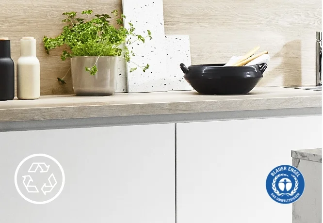 De melamine spaanplaat van Senso bestaat voor 100% uit gerecycled materiaal. Ze wordt geproduceerd zonder het gebruik van nieuwe vezels. Bovendien is het Senso-oppervlak volledig recyclebaar, zodat het aan het einde van zijn levensduur kan worden gerecycled. Daarom heeft Senso ook het Blauer Engel-label. Ook vanuit het oogpunt van duurzaamheid is onze Senso een goede keuze!