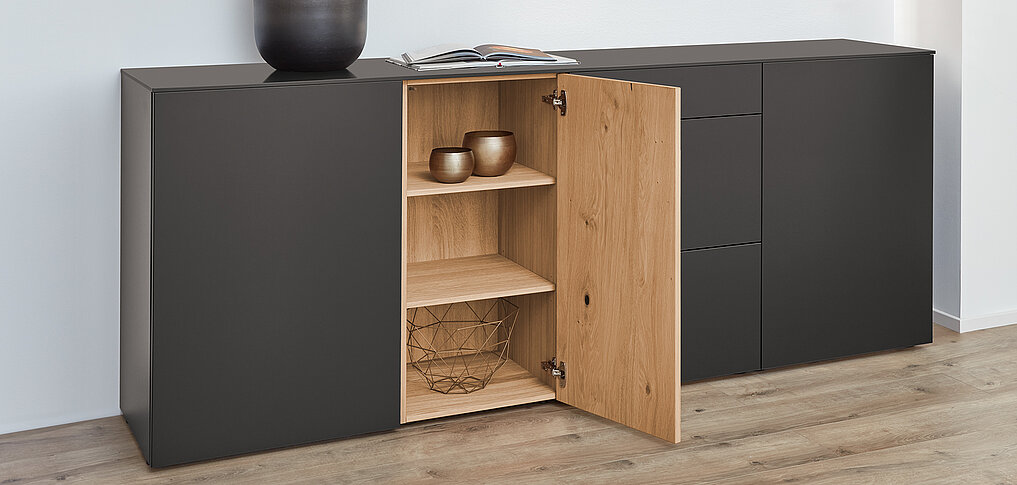 Als wandpaneel, dressoir, vitrinekast of highboard - meubels van echt houtfineer passen naadloos in je interieur en geven elke kamer een warme en uitnodigende uitstraling. Stijlvolle accenten kunnen worden gecreëerd in combinatie met effen kastelementen uit onze huidige collectie.