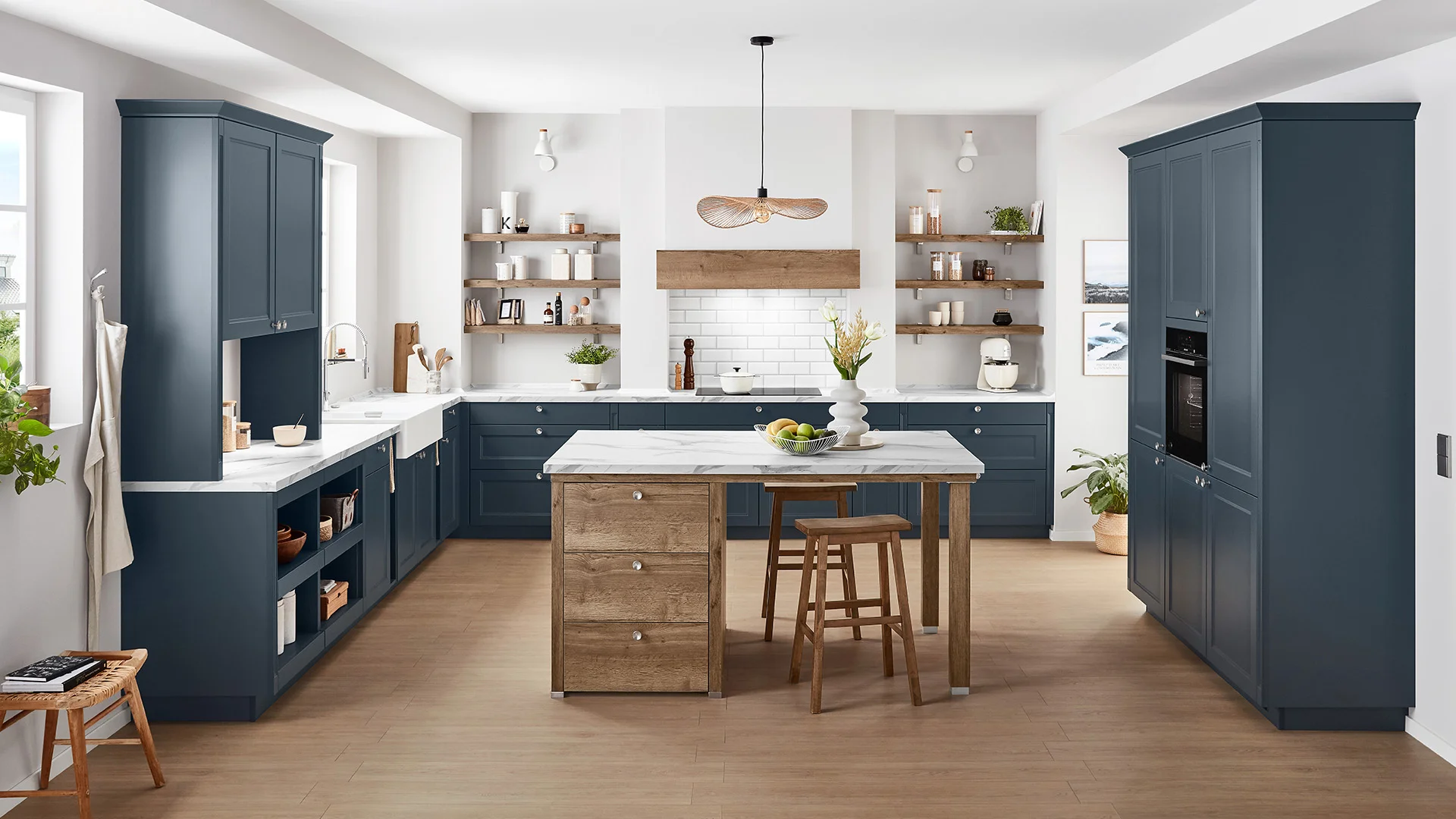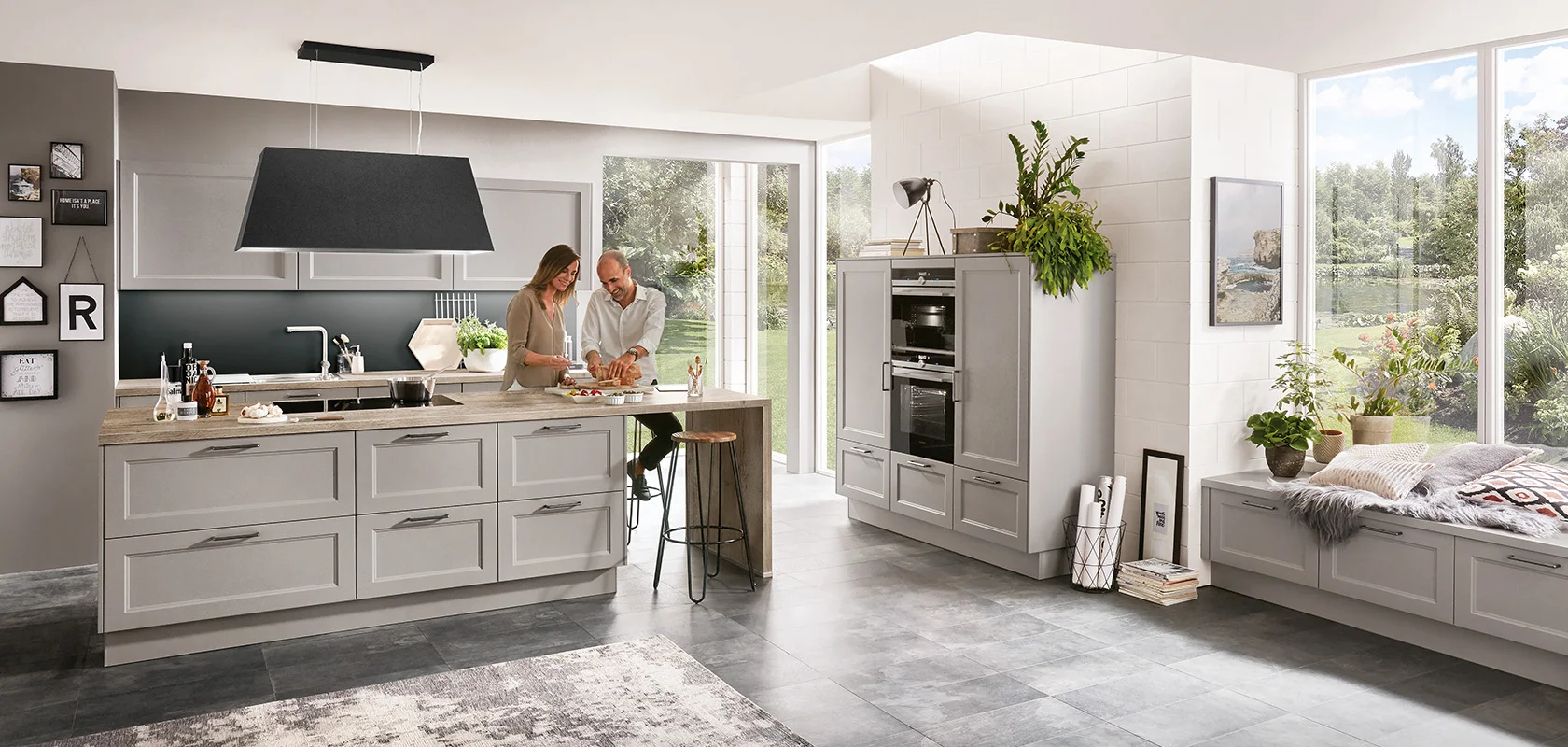 Groen ontmoet gezelligheid - deze keuken combineert een moderne landhuisstijl met frisse elegantie. Subtiele rietnuances en het royale stenen decorwerkblad creëren een ontspannen sfeer met karakter. Slimme oplossingen voor opbergruimte en creatieve ideeën, zoals een geïntegreerde nis voor de werkplek, maken het de perfecte mix van functionaliteit en gezelligheid.