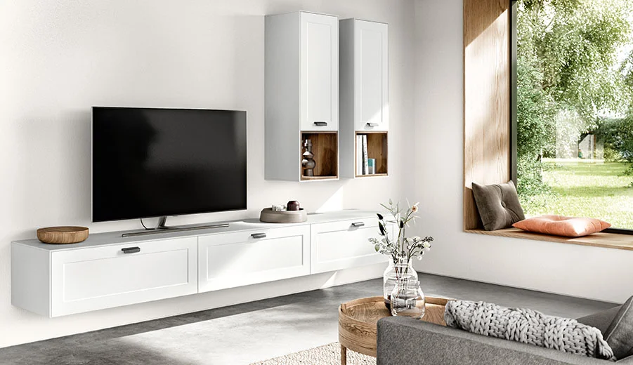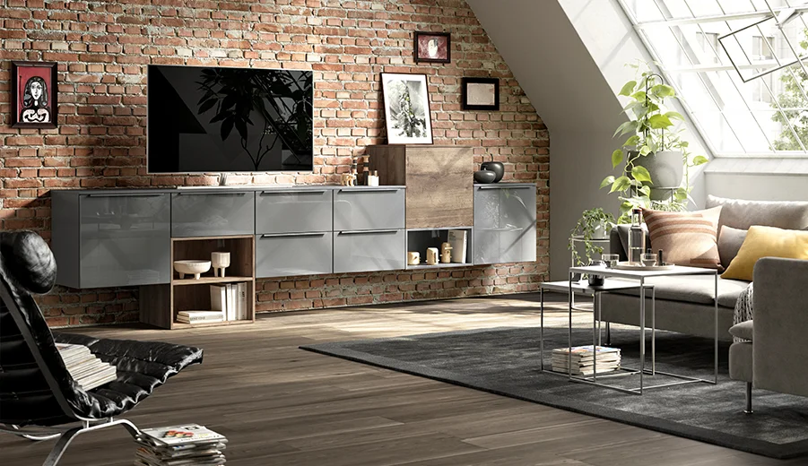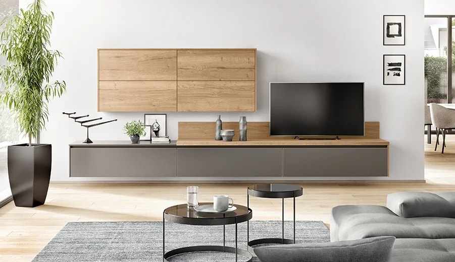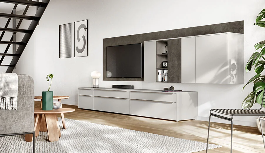 Het sideboard scoort met mat gesatineerde fronten in een effectieve glasoptiek en witte handgrepen. Het facetschap heeft een natuurlijke eiken look en het individuele Sign Emotion relingsysteem in aluminium heeft een zeer modern design in zwart.