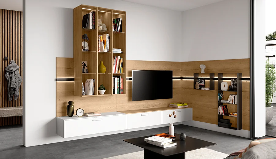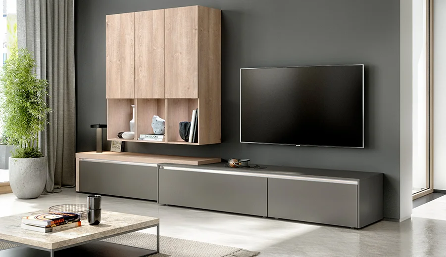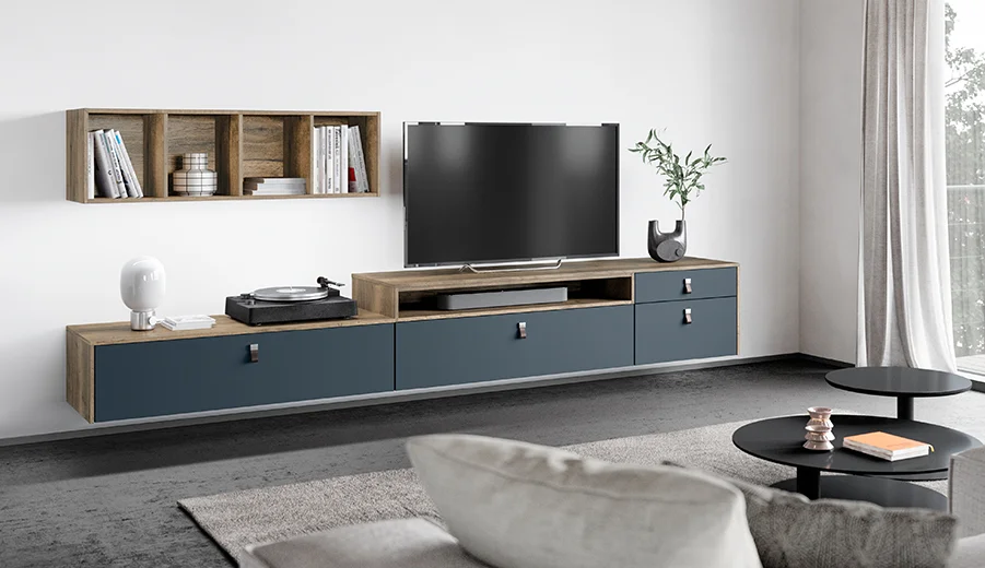 Een elegant welkom. Het zwevende sideboard in ultramat zwart met ton-sur-ton grepen wordt aangevuld door de wandplank in eiken-look. Combineer het met een groot formaat spiegel die harmonieus opgaat in het geheel.