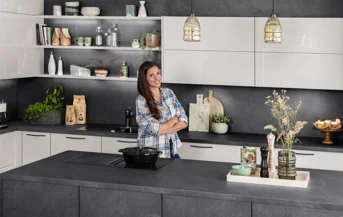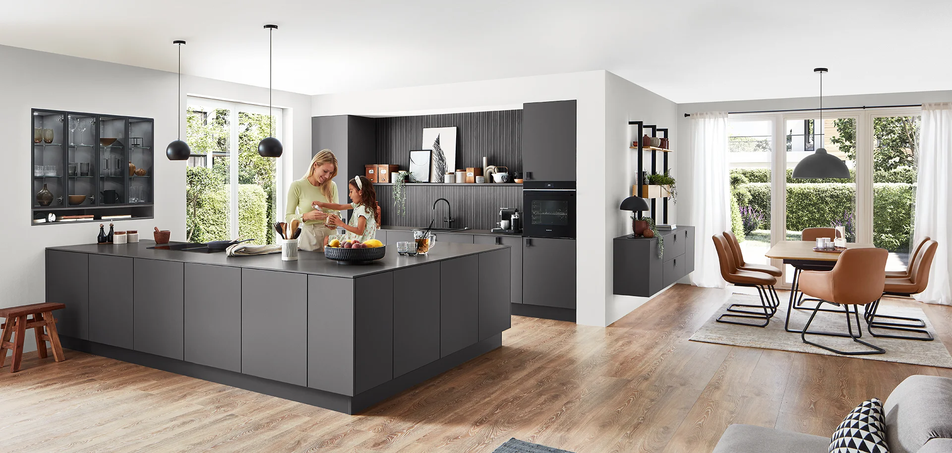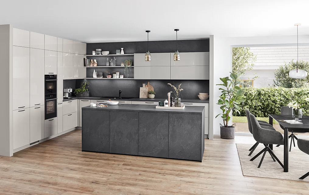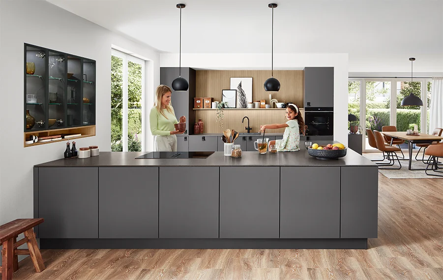 De perfecte match. Donkere oppervlakken, fraai gevormde grepen in mat zwart en koel metaal geven de keuken zijn individuele karakter. De keramische nisbekleding en het bijpassende werkblad in het decor Metal Oxid zijn gemakkelijk te reinigen en ongecompliceerd. Niet alleen voor liefhebbers van metaal een sterke oplossing.