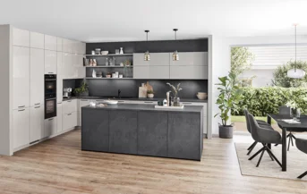 Ons front Artis in hoogwaardige glasoptiek in Alpin wit is beslist een blikvanger in deze designkeuken. Een sterk contrast hiermee: Het matte, diepzwarte werkblad Xtra Ceramic. Hiermee creëert u een modern en tijdloos interieur dat inspireert door zijn waarde.