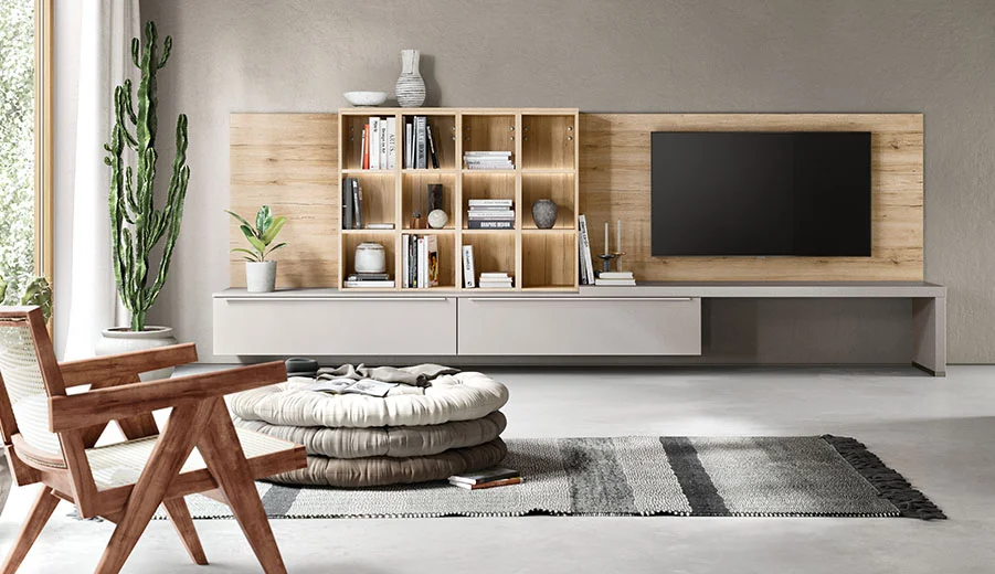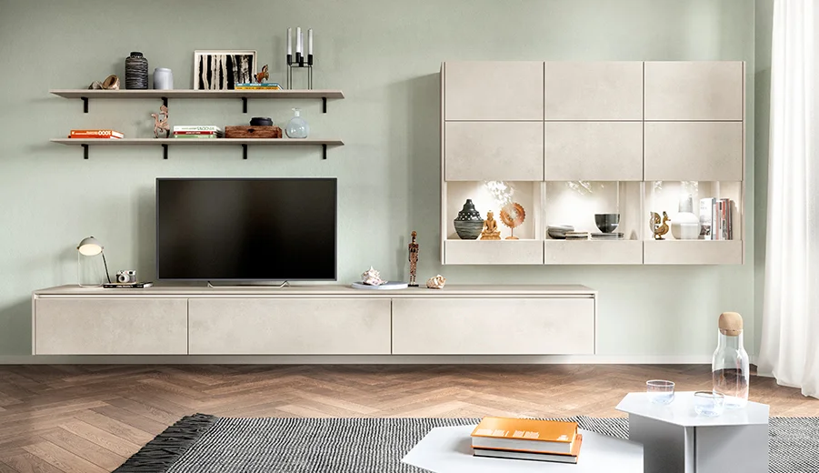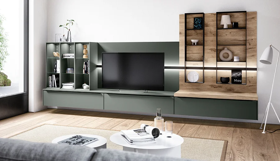 Groener wonen in de stad! Mineraalgroene elementen met grijze accenten geven dit woonontwerp zijn moderne natuurlijkheid. De keuken is een waar allround talent voor stedelijk wonen: Diverse oplossingen voor opbergruimte en creatieve details zoals de openkast met plantenlicht om het dagelijks leven duurzaam te maken. De kleine voorraadkast is discreet verborgen achter de gangdeuren. De functionele garderobeoplossing in de entree integreert perfect in de open ruimte. Bijzondere highlight: De combinatie van de beide Easytouch-fronten, die scoren met hun fluweelzachte, matte uiterlijk en onderhoudsvriendelijke anti-vingerafdrukcoating.