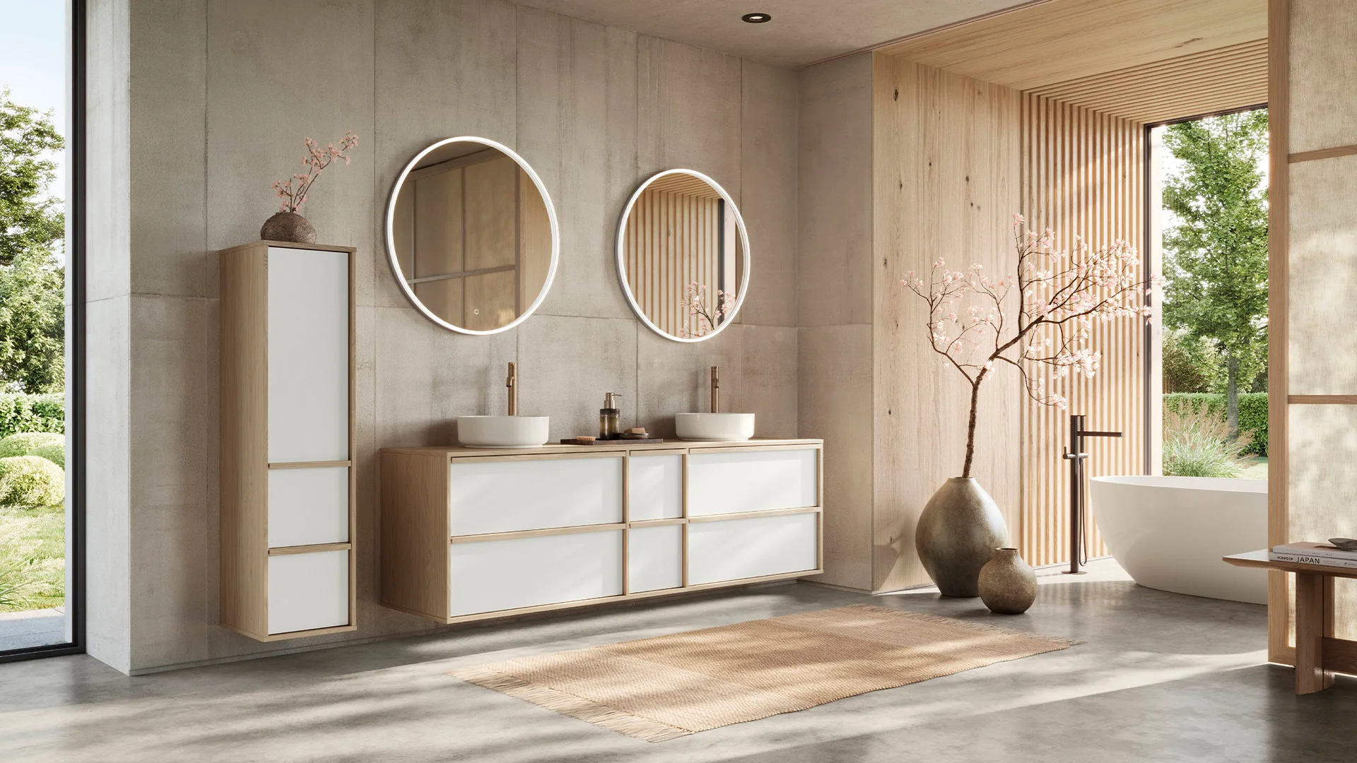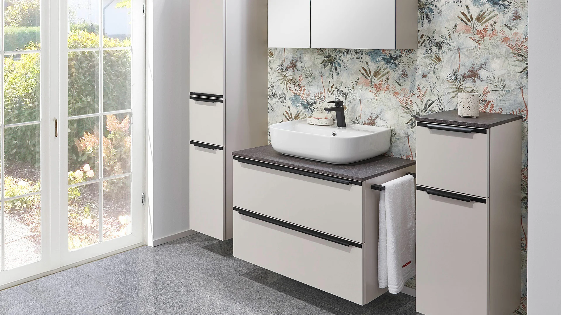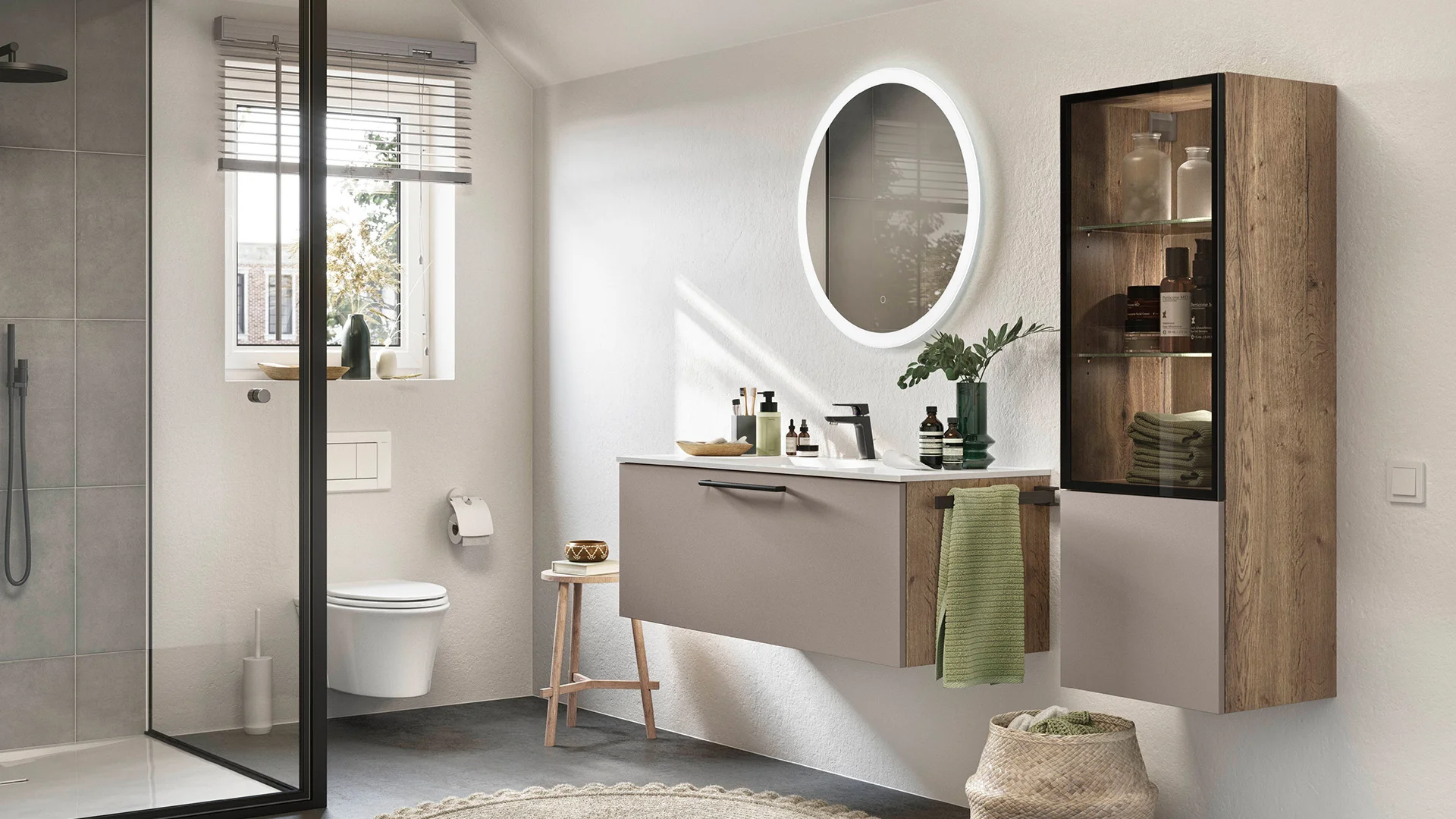 Większą przestronność każdej łazienki można uzyskać dzięki wielkoformatowym frontom i spójnej koncepcji kolorystycznej, np. w delikatnej szarości taupe. Zintegrowane elementy szklane i wisząca szafka podumywalkowa optycznie powiększają i rozluźniają przestrzeń. Wykorzystaj możliwości oferowane przez detale, takie jak czarne uchwyty, baterie i wieszaki na ręczniki.